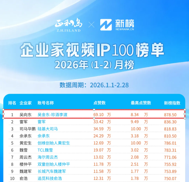 3月17日,正和岛联合新榜发布2026年1-2月《企业家视频IP100榜单》,珍酒李渡集团董事长吴向东视频号“吴金东—珍酒李渡”荣登榜首股票配资网址,小米集团董事长雷军位列第二,硅基智能董事长司马华鹏位列第三,华为常务董事余承东位列第四。
