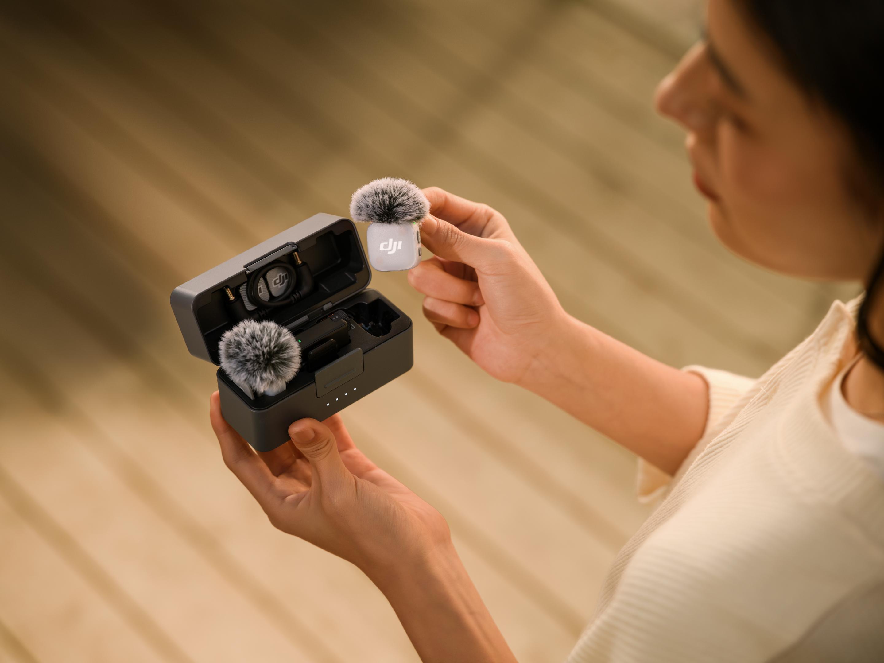 收纳采用一体式设计,充电盒可直接收纳两个发射器和一个接收器,不用拆下防风毛套、磁铁或背夹,盒内还设有专门位置存放配件。同时大疆还推出了手机版一发一收充电盒,更适合手机录音使用。