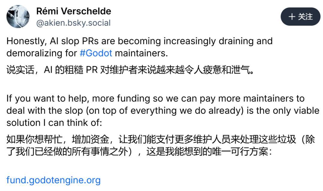 Godot 主要维护者之一、同时也是 Godot 商业支持公司 W4 Games 联合创始人的 Rémi Verschelde 表示,所谓的“AI slop”(AI 生成的低质量内容)正在持续涌入项目仓库,Pull Request 数量和审查压力都在飙升。