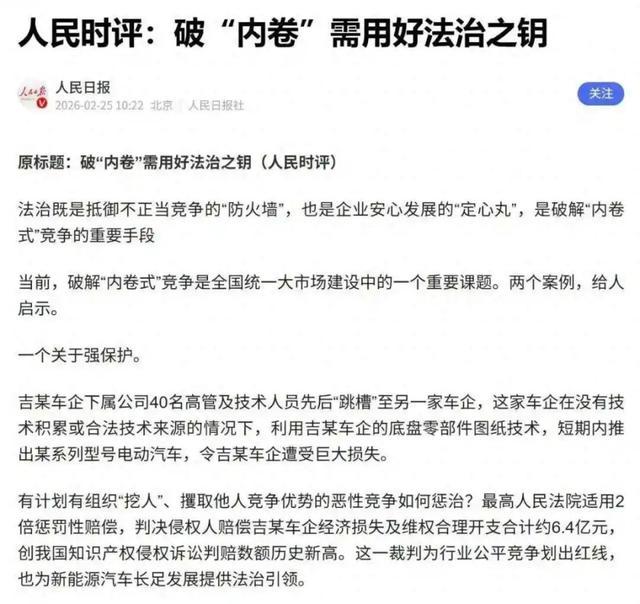 日前,央媒《人民日报》发布了一篇名为《破“内卷”需用好法治之钥》,其中就提到了,吉某车企下属公司40名高管和技术人员,先后跳槽到另一家车企,这家车企在没有技术积累和合法技术来源的情况下,利用吉某车企的底盘零部件图纸和技术,短期内推出了某系列型号电动汽车,令吉某车企遭受了巨大损失,最终吉某车企获赔6.4亿元巨额赔偿。